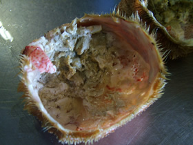 ![]() 毛蟹のカニミソは、本体と甲羅の中にあります。 |