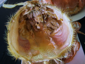 ![]() 道東や北海道沖のオホーツク海の毛蟹は、 蟹味噌も黄色できれい。 但し、オホーツク海でもロシアの毛蟹は、 蟹味噌が入ってないことで有名。 |
