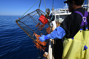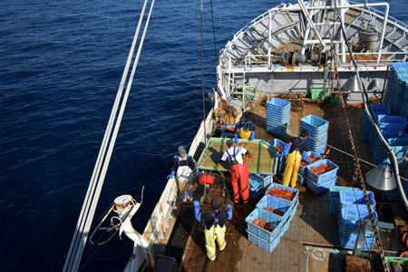 港を出て2時間で漁場に到着。 目印の浮きを回収して、仕掛けたカニ籠を引き揚げます。 |
