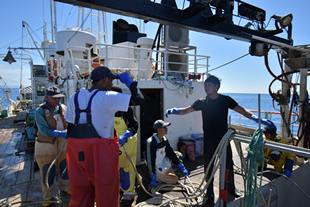 | この船の若い漁師さんのチーフ兼機関長が海外からの研修生を指導。 | 若手は、全員、インドネシアからきた研修生。みんな笑顔でとても働き者でした。日本の漁業を支えてくれています。 | ロープの結び方を指導中。 |