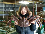| お姉さんたちが、水槽から一番大きなタラバガニを選び、カニ足をギュッと掴み取り出して持ったわけではありません。 カニが暴れないように、ゆっくりそっとカニを持たせて上げます。 想像以上に重く、大きく、危険で、持つだけでトゲで痛い!! タラバガニを持つと、トゲで手が血だらけになる。 爪で挟まれたら指が骨折、切断されるかも。そんな危険性がいっぱい。 |