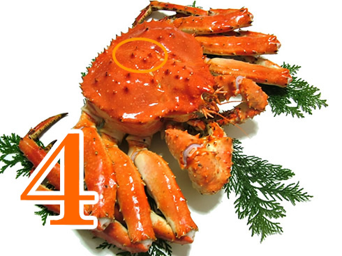 ですから、この写真のカニは、トゲが6個だから本タラバガニです。 もちろん、これは、ゆでたカニでも、生きたカニでも共通の見分け方です。 |