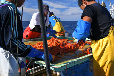| 紅ズワイガニ漁は、港を出てから寝る間も惜しんで3日間、ぶっ続けで漁をします。 カニ漁のシーズンも終わりに近い夏、1日だけの漁に同行させてもらいました。 1週間前に設置したカニ籠を引き上げに行きます。 漁場に行ってカニ籠をあげる、漁場を移動する、移動中にカニ籠を投入の準備をする、カニ籠を海に投入するを繰り返す。 休む暇なく作業をするハードなカニ漁なんです。 |