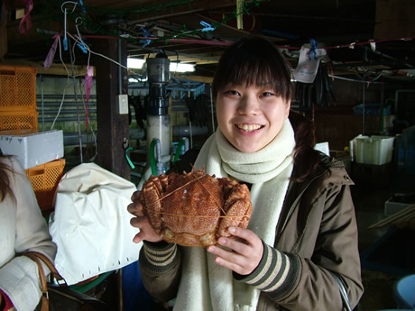 ゆでた赤いタラバガニを持って記念写真!! 「本タラバガニ」の持ち方!ボイルタラバ編! |