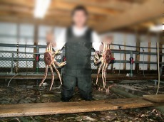 身が詰まっている前提で、左の写真のカニの重さは、どのくらい? たぶん、カニ従事者なら、即答レベルです。 経験からの甲羅や足の形状が判断基準です。正確な重さは、もちろん、ちゃんと計りに置いて計ります。 写真は、タラバガニですが、毛蟹も、ズワイガニもプロならわかると思います。 |