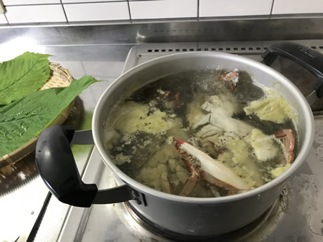 | 鍋にお湯を沸かしている間に、ワタリガニを軽く水洗しておきます。 |