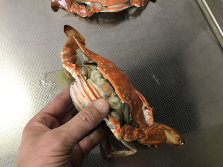 | ワタリガニのメス。卵が見えませんが、卵(内子)が入っている。 | ワタリガニのメス。黄土色の卵は、「外子」と呼ばれる卵。内子は美味しいですが、外子は、たいしたことないです。 |